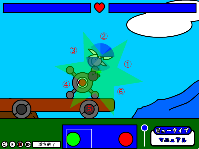 上図でいうと@AEの内@の位置が一番砲弾を当てられ易い凹み部分ですから@の位置にバリア正面の凹み部分が来る様に壁玉の角度を調整します。 |