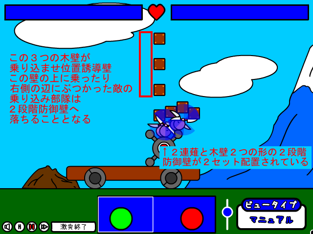 乗り込ませ位置誘導壁を置くことによって敵乗り込み部隊が2段階防御壁の上へ乗る確率が上がります。