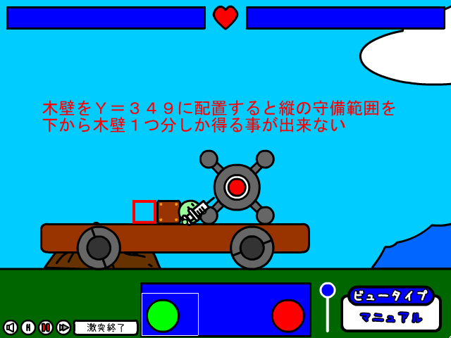 要塞は中に浮いている時間よりも中に浮いていない時間の方が長いので木壁のY位置は333ドットが最善でしょう。